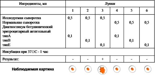 Возбудитель ботулизма - Clostridium botulinum вырабатывает токсины семи сероваров (А, B, C, D, E, F, G), однако чаще других встречаются серовары А, В, Е. Все токсины отличаются по антигенным свойствам и могут быть дифференцированы в реакциях типоспецифическими сыворотками. Для этой цели можно поставить реакцию пассивной (непрямой) гемагглютинации с сывороткой больного, в которой предполагается наличие токсина, и эритроцитами, нагруженными антителами антитоксических противоботулинических сывороток типов А, В, Е. Контролем служит нормальная сыворотка.
