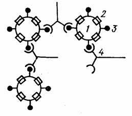 Рис. 3. Схема РПГА: эритроциты (1), нагруженные антигеном (3), связываются специфическими антителами (4).