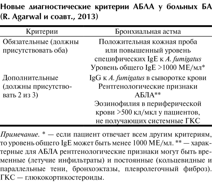 Ввиду особенностей клинической картины больные АБЛА обращаются за медицинской помощью к врачам разных специальностей — терапевтам, пульмонологам, аллергологам-иммунологам и др. Но, к сожалению, врачи недостаточно информированы о диагностике и лечении этого заболевания. Во многих странах, в том числе в России, АБЛА часто не распознают вовремя. В развивающихся странах, по данным A. Chakrabarti и др. (2002), в 30% случаев устанавливают неправильный диагноз туберкулеза легких. Результаты исследований D. Kirsten и D. Nowak (1993) свидетельствуют, что период между появлением первых симптомов и постановкой диагноза АБЛА может составлять до 10 лет. Международное общество микологии человека и животных (ISHAM) сформировало рабочую группу «АБЛА у больных бронхиальной астмой» для обобщения результатов современных исследований и составления руководств по диагностике и лечению этого заболевания [7]. Предложенные следующие новые диагностические критерии.