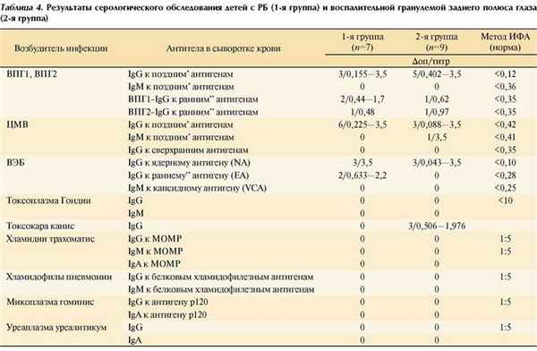Иммунологические исследования по дифференциальной диагностике РБ и ретинита Коатса показали высокий уровень эритропоэтина (до 90% при стадии Т3) в сыворотке крови у больных с опухолью и отсутствие цитокина при ретините Коатса и у здоровых детей [6], что позволило провести дифференциальную диагностику опухолевого и псевдотуморозного процесса. Однако до настоящего времени сравнительный анализ инфекционного статуса у детей с РБ и воспалительной гранулемой заднего полюса глаза не проводили.