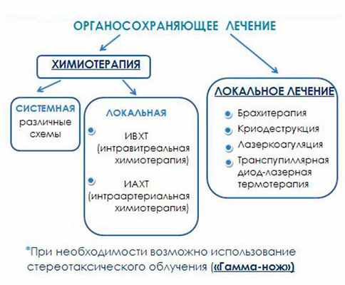 При двустороннем раке – фотокоагуляция, внутриартериальная химиотерапия или односторонняя энуклеация с фотокоагуляцией, криотерапия и облучение другого глаза