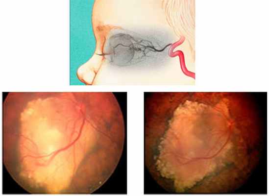 Ретинобластома – рак, возникающий из незрелой сетчатки. Симптомы и признаки обычно включают лейкокорию (белый рефлекс зрачка), косоглазие и реже воспаление и нарушение зрения. Диагноз ставят на основании офтальмологического обследования, УЗИ, КТ или МРТ. Лечение небольшой опухоли и двустороннего заболевания может включать фотокоагуляцию, криотерапию и лучевую терапию. Лечение поздних стадий рака и некоторых крупных опухолей проводят с помощью энуклеации. Химиотерапию иногда используют для снижения объема опухоли и лечения рака, диссеминировавшего за пределы глаза.