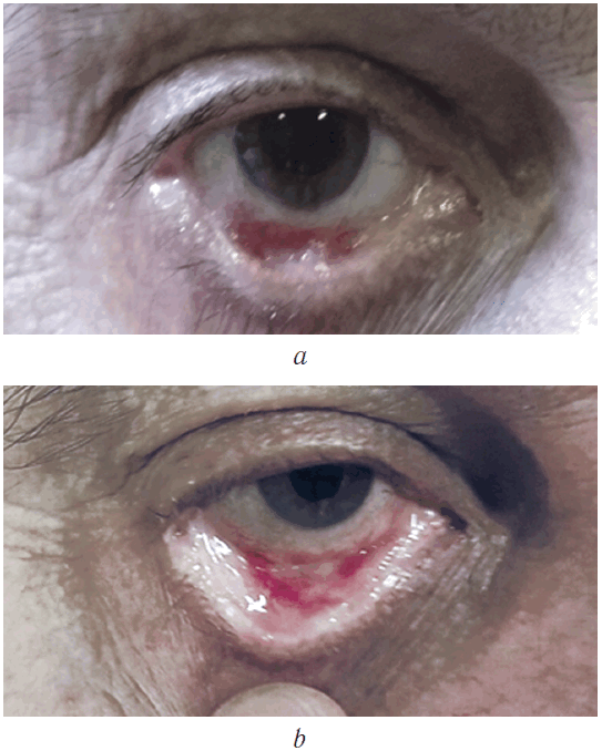 Рис. 1. Внешний вид пациента (правый глаз, нижнее веко оттянуто): a — при поступлении; b — через 6 месяцев после операции