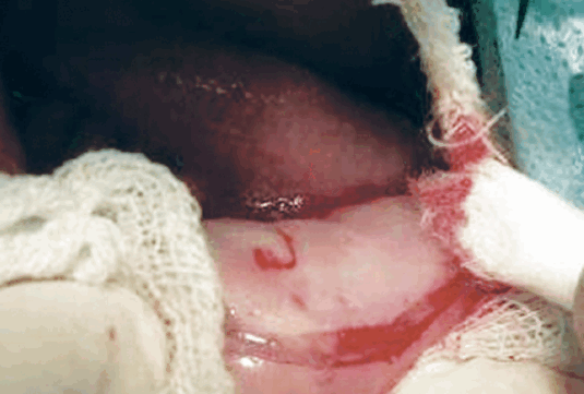 Пациенту было выполнено устранение симблефарона с правой стороны пластикой свободным лоскутом слизистой губы (рис. 2). Конъюнктива была отсечена от края века, мобилизована и подшита к склере в области нижнего свода тремя П-образными швами (викрил 8/00). Дефект конъюнктивы нижнего века был восстановлен за счёт свободного лоскута слизистой внутренней поверхности губы (викрил 6/00). На рану губы наложено 3 направляющих шва (викрил 4/00).