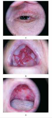 При осмотре 25.09.12 на слизистой оболочке полости рта выявлены множественные эрозии, конъюнктива глаз гиперемирована, отечна, имеется симблефарон. Высыпаний на коже нет. На основании клинической картины и длительности процесса диагностирован рубцующийся пемфигоид (см.рисунок). Рисунок 1. Больная М., 77 лет: рубцующийся пемфигоид. а — глазная щель сужена, конъюнктива гиперемирована, отечна; б — эрозии на слизистой оболочке полости рта ярко-красного цвета, не окаймлены отслаивающимся эпителием; поверхность свободна от наслоений; в — эрозии на слизистой оболочке твердого неба; язык обложен белым налетом.