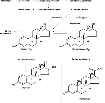 Рис. Химическая структура и пути синтеза эстрогенов и прогестерона