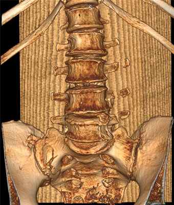Клинический пример 1. Пациентка Р., 68 лет, травма в результате ДТП, пассажир. Доставлена бригадой скорой медицинской помощи (СМП). Установлен диагноз: политравма. Перелом боковых масс крестца справа Denis I. Перелом седалищной кости справа со смещением отломков. АО/ОТА — 61-В2.1 Перелом поперечных отростков слева L3–L5 (рис. 1). Рис. 1. Пациентка Р., 68 лет. Компьютерная томограмма, 3D-реконструкция, визуализирован перелом поперечных отростков слева L3–L5. Перелом боковых масс крестца слева Denis I. Закрытый перелом дистального метаэпифиза обеих костей правого предплечья со смещением отломков. Ушиб грудной клетки. По шкале ISS 21 балл.
