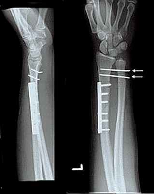 Лучевая и локтевая кости по строению изнутри полые. И если пластина ставится на кость, то штифт вводится внутрь кости. Для установки штифта делаются несколько небольших разрезов (проколов кожи) - в области лучезапястного и локтевого суставов. Удаляют штифты примерно через год. Полноценные нагрузки, в т. ч. Спортивные, вне зависимости от выбранного метода остеосинтеза, можно начинать не менее чем через три месяца.