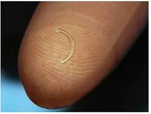 В нашей практике используются отечественные ИРС, изготовленные в ООО Научно-экспериментальное производство «Микрохирургия глаза» из полиметилметакрилата, представляющие собой сегмент с дугой протяжённостью 160 °(90, 120, 160, 210°), основанием 0,6 мм, высотой 150 – 450 мкм, внутренним диаметром 5,0 мм и наружным 6,2 мм, с поперечным сечением в форме полусферы (рис.3).