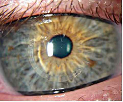 Предварительно в роговице формируются роговичный туннель, через который вводятся роговичный сегмент, что приводит к уплощению центральной зоны роговицы. Не маловажным аспектом этой операции являеться ее реверсивность –т.е. возможность замены или удаления сегмента, если зрение изменится с возрастом. Это возможно потому, что не повреждается центр роговицы и не удаляется роговичная ткань. На следующий день после операции глаз пациента абсолютно спокоен и после непродолжительной реабилитации пациент может преступать к повседневным зрительным нагрузкам (рис. 4 Следует отметить, что имплантация интрастромальных сегментом не влияет на косметику больного и позволяет ему пользоваться мягкими контактными линзами. В зависимости от показаний возможна комбинация кросслинкинга и интростромальной имплантации роговичных сегментов.