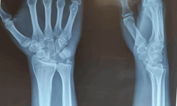 - нарушение целостности запястных арок (три дуги: по проксимальному краю ладьевидной, полулунной и трехгранной костей, по их дистальному краю и между первой и второй дугами через центры их костей) - признак Gilula;
