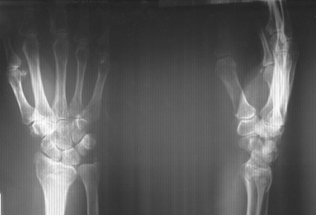 - величину суставных щелей в лучезапястном, среднезапястном и запястно-пястном суставах (в норме 2-2,5 мм) и расстояние между костями запястья (в норме 2 мм);