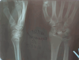 На рентгенограммах, выполненных в 1-е сутки после операции, у всех пациентов положение костей запястья и соосность суставных поверхностей были правильными.