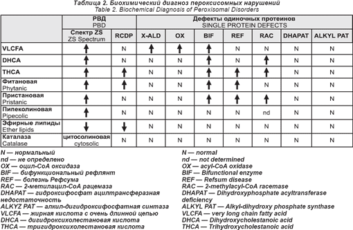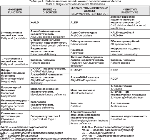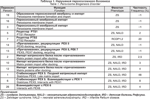 В табл. 1 показано, что 12 из дефектов PЕХ могут быть связаны с каждым их трех фенотипов (ZS, NALD, IRD). Пока полного понимания этого еще нет, проведенные исследования выращенных фибробластов показали, что клеточные линии от больных с более легкими фенотипами сохранили некоторое их количество, чтобы импортировать пероксисомный белок.