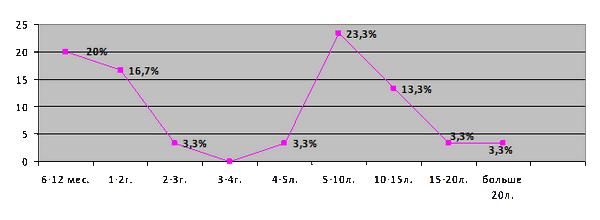 По данным разных авторов, наиболее часто метахронные опухоли встречаются в сроки от 5 до 10 лет после лечения первого новообразования [2]. В нашем же исследовании интервал между обнаружением первой и второй злокачественной опухоли толстой кишки колебался в широких пределах – от 6 месяцев до 38 лет. Однако пик диагностики приходился на первые 2 года либо в период с 5 до 10 лет после первой операции (рисунок 1)