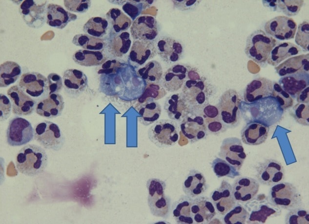 - Люмбальная пункция : положительный амебы антитела анти Naegleria или положительным порка теста (два полярных жгутиков) может быть обнаружена в спинно - мозговой жидкости , сам по себе часто гнойной и гему, но их отсутствие не исключают возможности из MEAP, это отсутствие бактерий, несмотря на преобладающую подозрительную клинику.