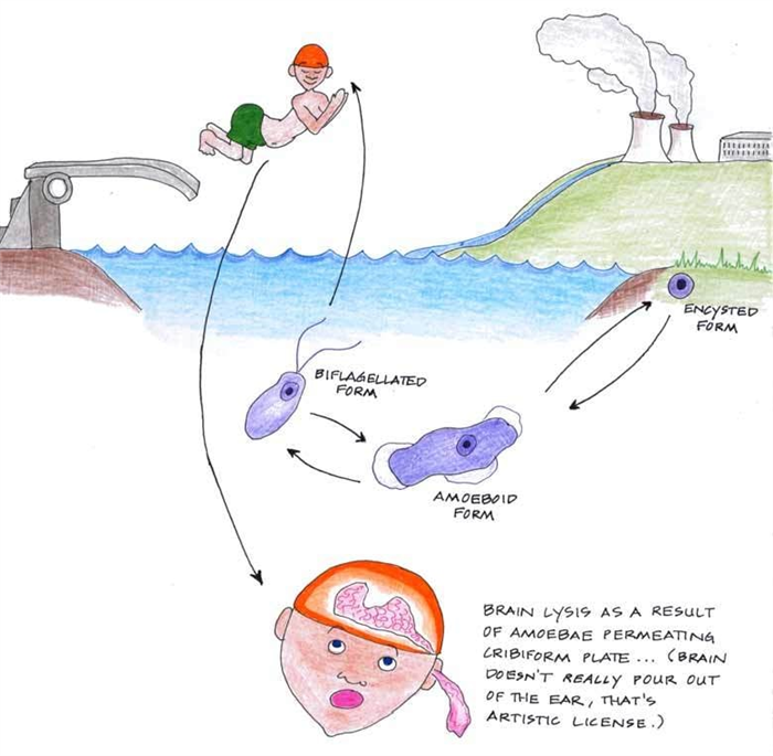 Неглерия Фоулера обитает в пресных, теплых водоемах, а во время купания бактерия попадает в носовую полость человека и по каналу обонятельного нерва перемещается к головному мозгу.