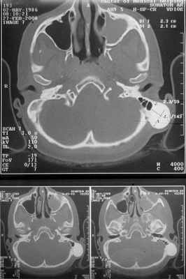 До настоящего времени остеомы височной кости относят к казуистическим наблюдениям [1]. Рост остеом может наблюдаться в различных областях височной кости. В большинстве случаев описаны остеомы, исходящие из задней стенки наружного слухового прохода [2], реже - из его верхней и передней стенок [3], из внутреннего слухового прохода [4, 5], барабанной полости, чешуи височной кости 6, сосцевидного отростка 12.