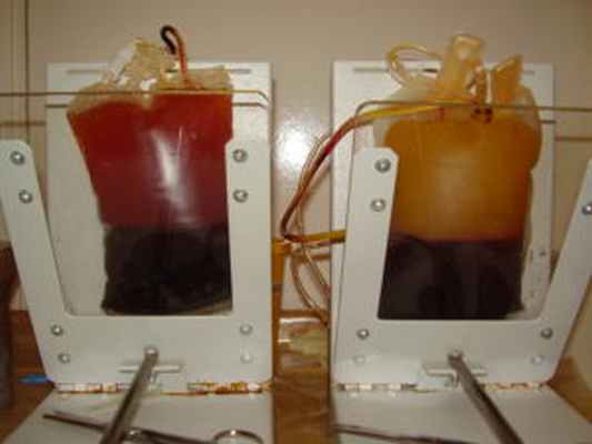 Фото 2. Отделенная плазма при заболеваниях имеет ненормальный цвет (белый, зеленоватый, красноватый за счет содержащихся в ней патологических примесей) и подлежит удалению. В норме у здоровых людей плазма соломенно-желтая, прозрачная.