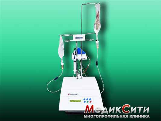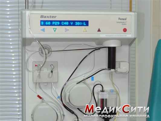 - Автоматический метод основан на разделении непрерывного потока забираемой крови в сепараторе аппарата Hаemonetics PCS-2 (USA) в сочетании с автоматической подачей антикоагулянта, автоотбором плазмы и возвратом в венозное русло клеток. Это имеет свои преимущества: небольшой объем заполнения системы для крови и комфортность процедуры, непрерывный цикл взятия, разделения крови и возвращения клеток больному, незначительная травматизация их, удобство в эксплуатации, значительная быстрота. Длительность сеанса – 60-120 мин, объем удаляемой плазмы – 500-1000 мл, при необходимости — больше.