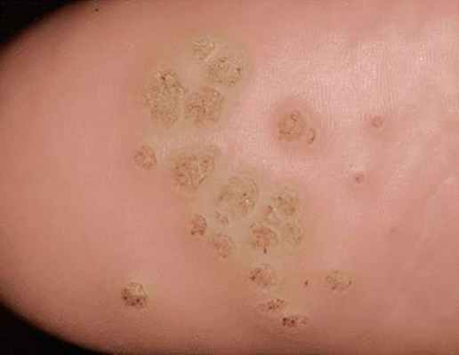 - ладонно-подошвенные. Имеют вид плотных образований с утолщенным роговым слоем. Необходимо отличать их от мозолей и потертостей кожи, а также от сифилитической подошвенной папулы. Инфекция может распространяться из-за неудобной обуви и чрезмерной потливости;