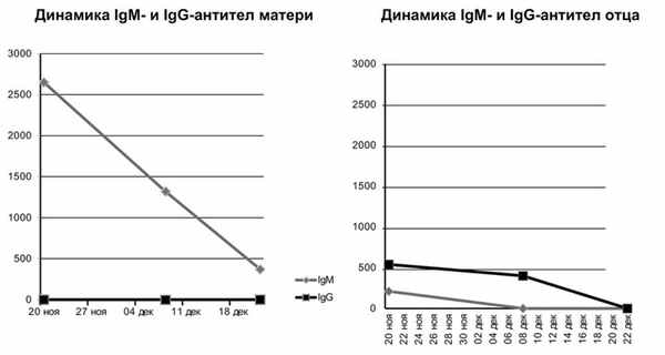 У родителей ребенка в сыворотке крови обнаружены специфические антитела к P. jiroveci(рис. 4). У матери выявлены антитела класса IgM в титре 1:2650, которые при динамическом исследовании снизились до 1:1320 и в дальнейшем до 1:370; при этом антитела класса IgG не выявлены. У отца антитела IgM в незначительном титре (1:210) определены в начале исследования и позже исчезли, в то же время зафиксированы в диагностическом титре IgG, которые через 18 дней снизились до 1:400 и позже (через 2 нед) не определялись. Эти результаты свидетельствуют о затухании инфекционного процесса у отца ребенка и позволяют предположить, что он был источником инфекции для жены, вероятно, во второй половине беременности, и заражение плода произошло трансплацентарно.