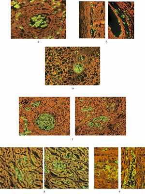 Рис. 2. Пневмоцисты в аутопсийном материале. а — костная ткань; б — легкие; в — надпочечник; г — слюнная железа; д — миокард; е — почка (метод НРИФ, с использованием конъюгата, окрашенного ФИТЦ; ув. 400).