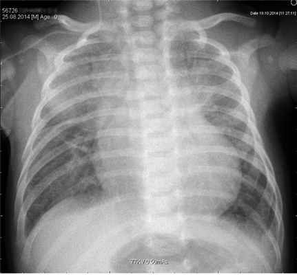 18 октября 2014 г. в реанимационное отделение Морозовской детской больницы бригадой скорой помощи госпитализирован мальчик Д. в возрасте 1 мес 3 нед в тяжелом состоянии. При осмотре ребенок был в сознании, температура тела 37,5 °С, выраженная бледность, мраморность и желтушность кожи; симптом рекапилляризации 5—7 с. Большой родничок 1,5×1,5 см не напряжен. Дыхание самостоятельное с подачей увлажненного кислорода через носовую канюлю, кислородная зависимость. Выраженная одышка с втяжением уступчивых мест грудной клетки. Частота дыханий 65 в минуту. Перкуторно определяется легочной звук, с притуплением на верхушке правого легкого; аускультативно дыхание жесткое, крепитирующие хрипы сзади справа. Тоны сердца ритмичные, громкие, грубый систолический шум на верхушке, проводится во все отделы сердца. Пульс 150 уд/мин, артериальное давление 78/55 мм рт.ст. Живот мягкий, печень выступает из-под реберной дуги на 2 см. Стул на момент осмотра желто-коричневый, кашицеобразный. Очаговые и менингеальные симптомы отсутствуют. Зрачки узкие, реакция на свет вялая. Со слов родителей, ребенок заболел утром, когда его положили на живот, он начал кричать, кашлять, стал «тяжело дышать», побледнел, срыгнул створоженным молоком. На машине скорой медицинской помощи госпитализирован.