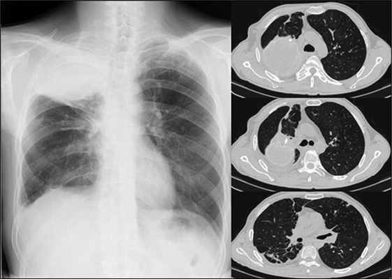 Рис. 1. Рентгенографическое (А) и КТ (Б) исследование органов грудной клетки у больного А. при поступлении (описание в тексте)