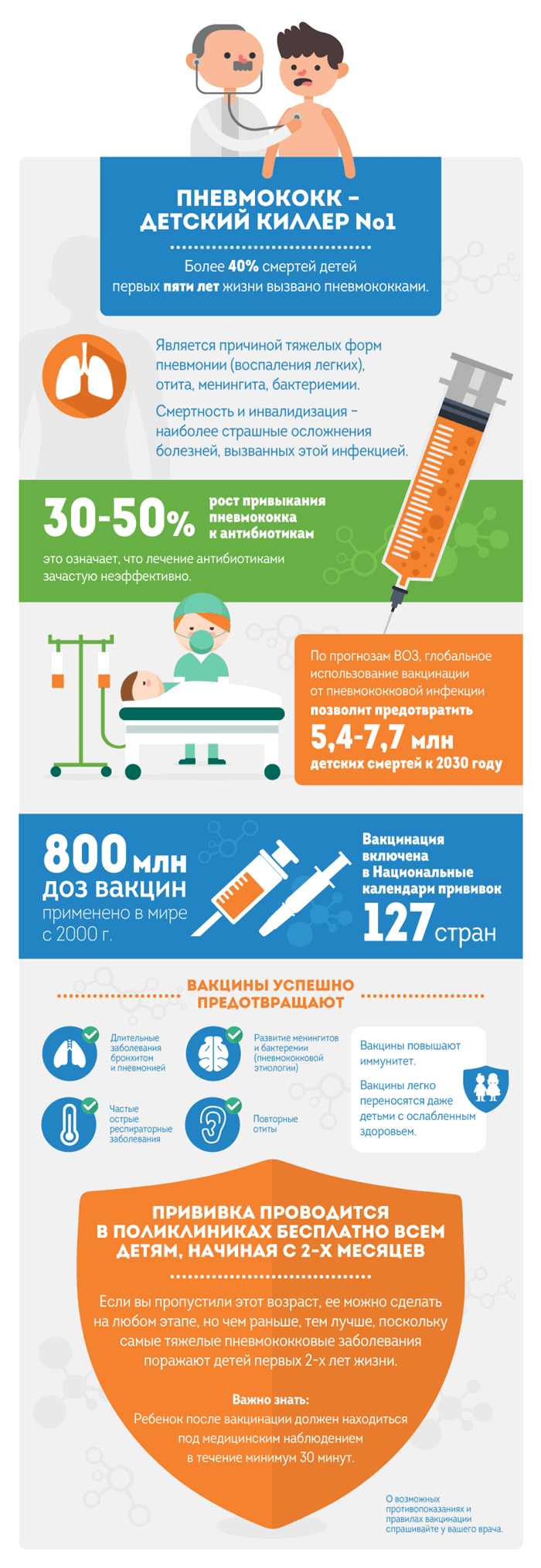 Первая прививка против пневмококковой инфекции делается ребенку в возрасте 2 месяцев, далее в 4.5 месяца. Ревакцинация проводится в 15 месяцев.