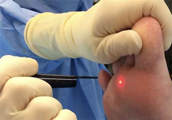 С помощью лазертерапии можно воздействовать на гемоглобин эритроцитов, содержащихся в кровеносных сосудах бородавки. При этом тепловая энергия экстраполируется на прилегающие ткани, что ведет к коагуляции кровеносных сосудов. В результате процедуры остается некротический участок с бородавкой, который легко отторгается [15]. В исследованиях по изучению эффективности лазертерапии после 2—3 сеансов показан положительный результат в 48—83% случаев при бородавках, расположенных на разных участках тела [16, 17].