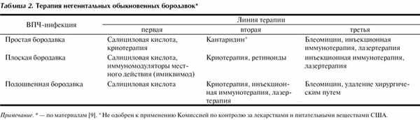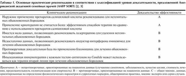 Методами, достоверно обеспечивающими удаление бородавок, являются наружное применение препаратов на основе салициловой кислоты (возможно применение в домашних условиях) и назначаемая врачом криотерапия. Инъекционная иммунотерапия при лечении негенитальных обыкновенных (вульгарных) бородавок может применяться на крупных, плохо поддающихся лечению другими средствами бородавках (табл. 1).