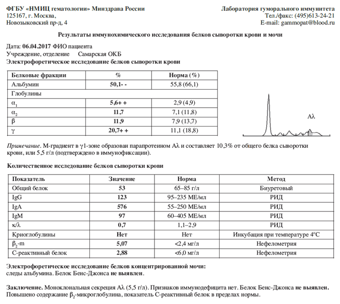 - Иммунохимическое исследование сыворотки крови и мочи: следовая моноклональная секреция А-лямбда. Иммунодефицита нет. b2 микроглобулин 3.23 (N