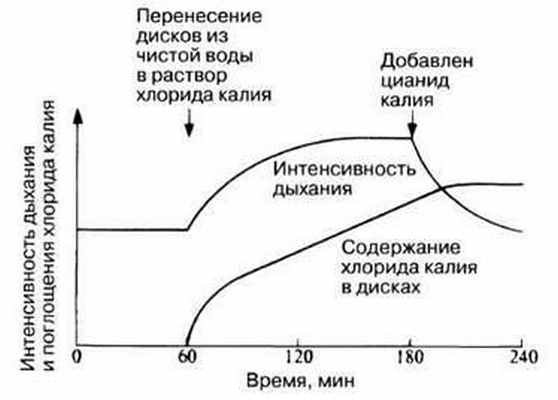 Рис. 13.20. Интенсивность дыхания и поглощения хлорида калия дисками из корнеплода моркови. (По данным Robertson, Turner, 1945.)