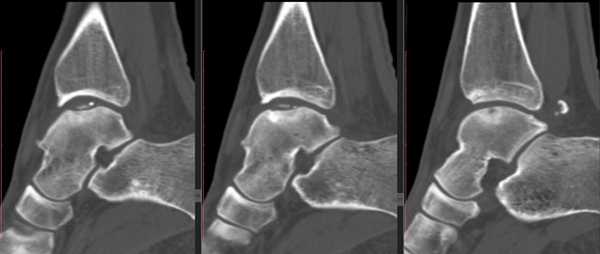 Размеры дефекта таранной кости оценивают по результатам рентгенологического и КТ-исследования.