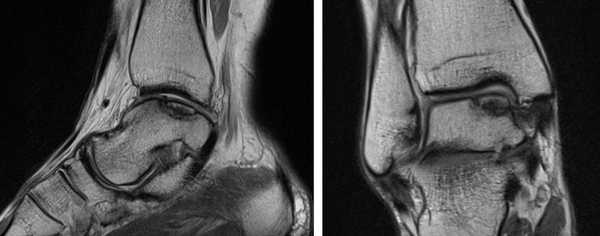 На МРТ выявляется рассекающий остеохондрит с отделением костно-хрящевого фрагмента от таранной кости.