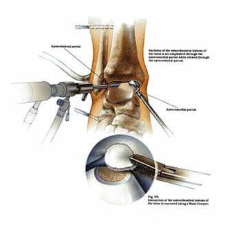 В ходе операции производят освежевание с помощью острого бора основания дефекта хряща таранной кости до появления кровоточащей поверхности