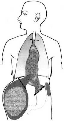 Операция выполнена 24.12. Произведена срединная лапаротомия. Обнаружена больших размеров опухоль средне- и нижнегрудного отдела пищевода, распространяющаяся на кардиальный отдел желудка, бугристая, малоподвижная, плотно выполняющая заднее средостение и поддиафрагмальное пространство. Правая доля печени огромных размеров, практически всю ее занимает метастаз, переходящий на IV сегмент (рис. 1). Рисунок 1. Схема распространения опухолевого процесса больного.