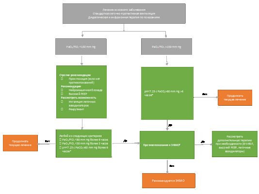 ЭКМО показана пациентам с высоким риском летального исхода. Существует несколько критериев измерения риска смертности при ОРДС, но большинство включают PaO2/FiO2 ниже 100, несмотря на оптимальную терапию. В недавнем многоцентровом проспективном исследовании EOLIA имеются три показания, которые определяют тяжелый ОРДС, когда ЭКМО может быть полезна (5). Следует использовать стандартизированные алгоритмы для лечения ОРДС – рисунок 1 (6). Если пациенты соответствуют показаниям, то ЭКМО следует начинать немедленно в опытном центре (7).