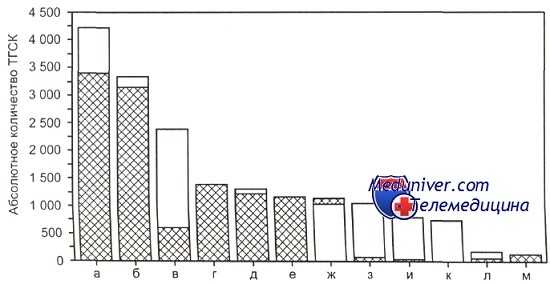 а — неходжкинские лимфомы; б — множественная миелома; в —ОМЛ; г — рак молочной железы; д — болезнь Ходжкина; е —другие опухоли; ж —ХМЛ; з — ОЛЛ; и — МДС/другие лейкемии; к — незлокачественные заболевания; л — ХЛЛ; м — рак яичников. Светлая часть столбиков - алло-ТГСК (n = 6700), заштрихованная — ауто-ТГСК (n= 11 000).