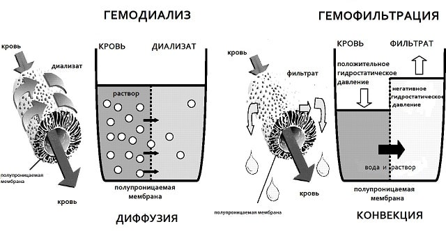 Во время гемофильтрации разница артериального и венозного давлений обеспечивает конвекционный транспорт растворенных веществ через волокнистую или плоскослойную мембрану. Это позволяет поддерживать высокую скорость удаления из крови воды и веществ с относительной молекулярной массой не более 40 000.