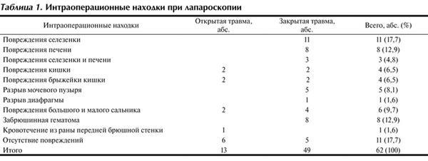 Повреждения, выявленные при лапароскопической ревизии брюшной полости, представлены в табл. 1.