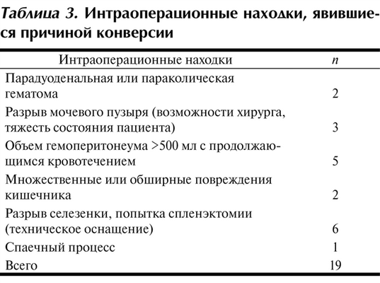 Таблица 3. Интраоперационные находки, явившиеся причиной конверсии