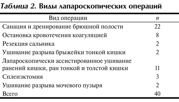 За период 2008—2013 гг. с использованием эндовидеохирургической технологии нами оперированы 56 больных (46 мужчин и 10 женщин) с различными повреждениями органов брюшной полости, средний возраст 34,9±1,5 года. В 22 случаях травма носила сочетанный характер, 20 больных поступили с изолированной закрытой травмой брюшной полости и 14 — с открытыми повреждениями, при этом в 13 случаях отмечены проникающие колото-резаные ранения, а в 1 — множественные огнестрельные ранения дробью. Состояние 20 больных при поступлении расценивалось как тяжелое, 23 — как средней тяжести и 13 — как удовлетворительное (по шкале ВПХ-СП).