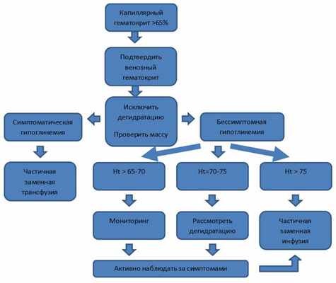 - б) при Ht вен > 65% + клинические признаки = нормоволемическая гемодилюция или частичная обменная трансфузия (эксфузию).