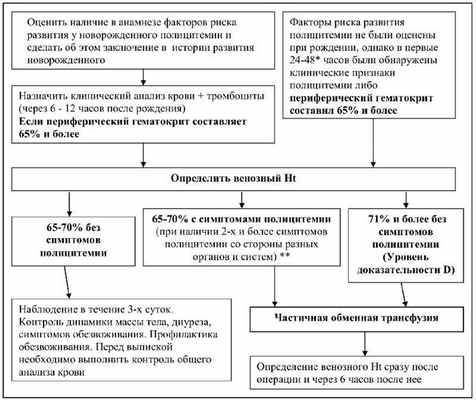 * — в случае появления клинико-лабораторных критериев наличия полицитемии у новорождённого в возрасте более 24–48 часов жизни необходимо провести дифференциальный диагноз с «ложной полицитемией», оценить убыль массы тела ребёнка, при необходимости (если убыль массы тела более 10% и есть симптомы дегидратации) провести мероприятия, направленные на регидратацию.