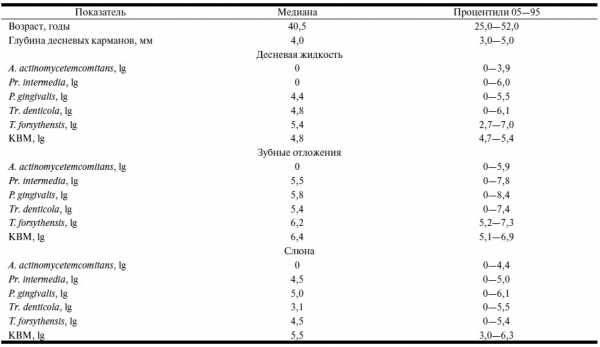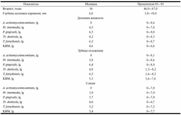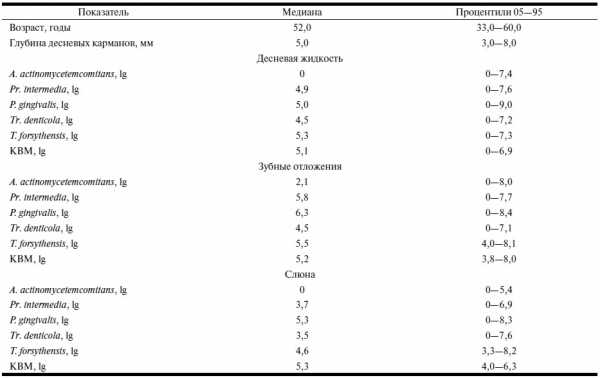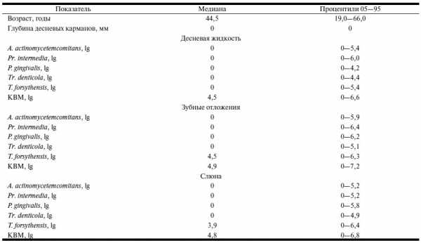 В группе здоровых лиц в отдельных случаях наибольшее количество микроорганизмов обнаруживалось в зубных отложениях, но и в них их количество не превышало 10 в 6,4 степени ГЭ/образец (для T. forsythensis); других микроорганизмов было еще меньше.