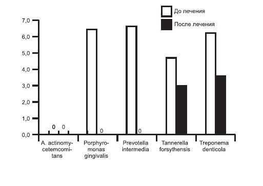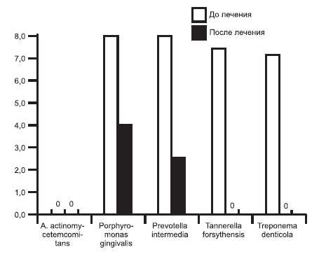 Исследованием установлены различия в снижении уровня микроорганизмов. В десневой жидкости после лечения выявлялась Tr. denticola, а в зубных отложениях — Pr. intermedia и P. gingivalis.
