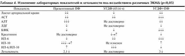 Как видно из табл. 4, наиболее эффективным методом экстракорпоральной детоксикации у больных со СПОН явилось использование комбинированной терапии. Также необходимо отметить, что залогом успеха применения ЭКМД является соблюдение следующих условий: правильность выбора метода, время начала применения, адекватный объем и длительность процедуры.