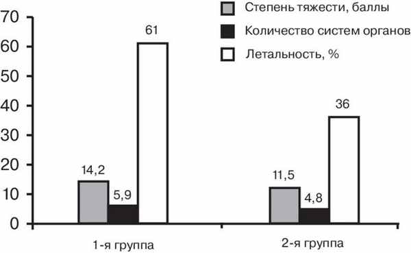 В послеоперационном периоде состояние больных 1-й группы было достоверно (р=0,05) тяжелее, чем 2-й, и летальность - выше в 1,7 раза (см. рисунок). Рисунок 1. Сравнение степени тяжести состояния, количества пораженных систем органов и летальности (p<0,05).